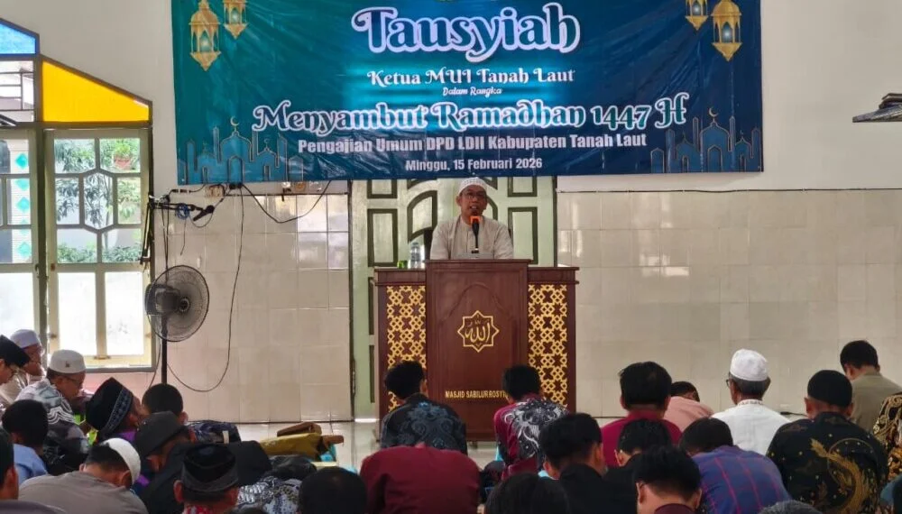 Tanah Laut (15/2) – Ketua Majelis Ulama Indonesia (MUI) Kabupaten Tanah Laut (Tala), KH Ahmad Syarifuddin Noor, menyampaikan tausyiah dalam pengajian umum Dewan Pimpinan Daerah (DPD) Lembaga Dakwah Islam Indonesia (LDII) Kabupaten Tanah Laut, Minggu (15/2/2026), di Masjid Sabilar Rosyad, Kelurahan Angsau, Pelaihari. Kegiatan tersebut dihadiri ratusan warga LDII dari berbagai wilayah di Tala.